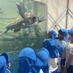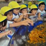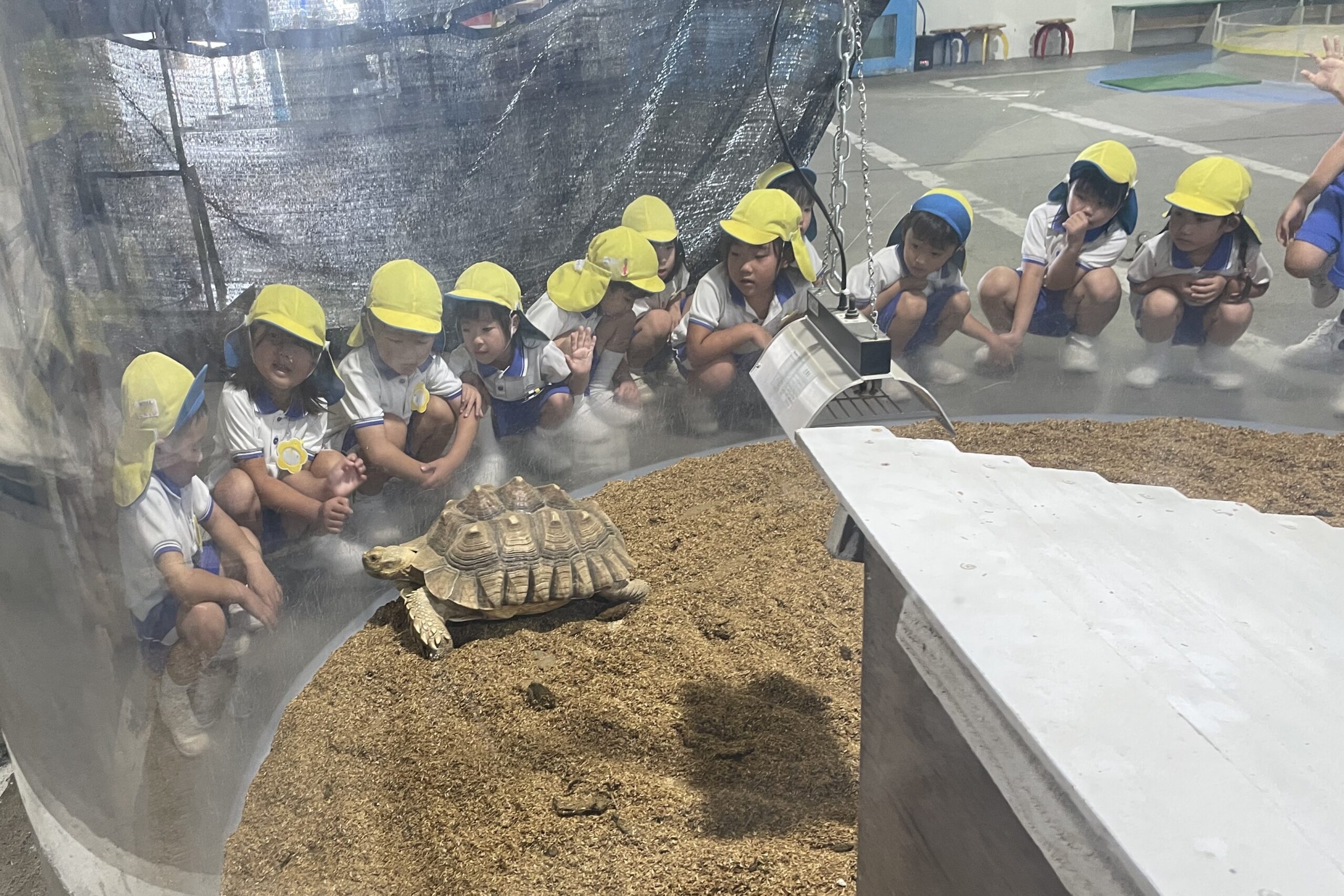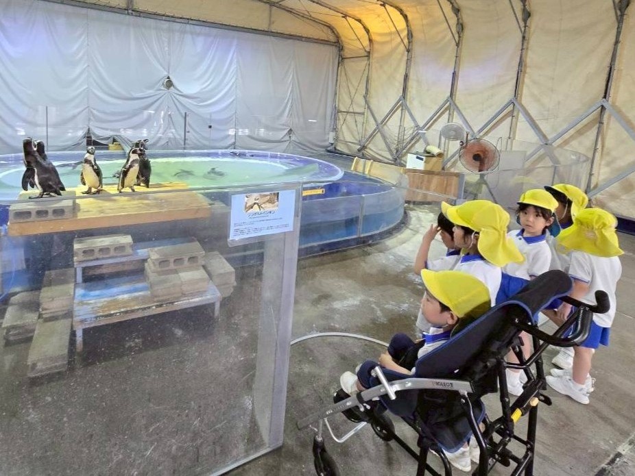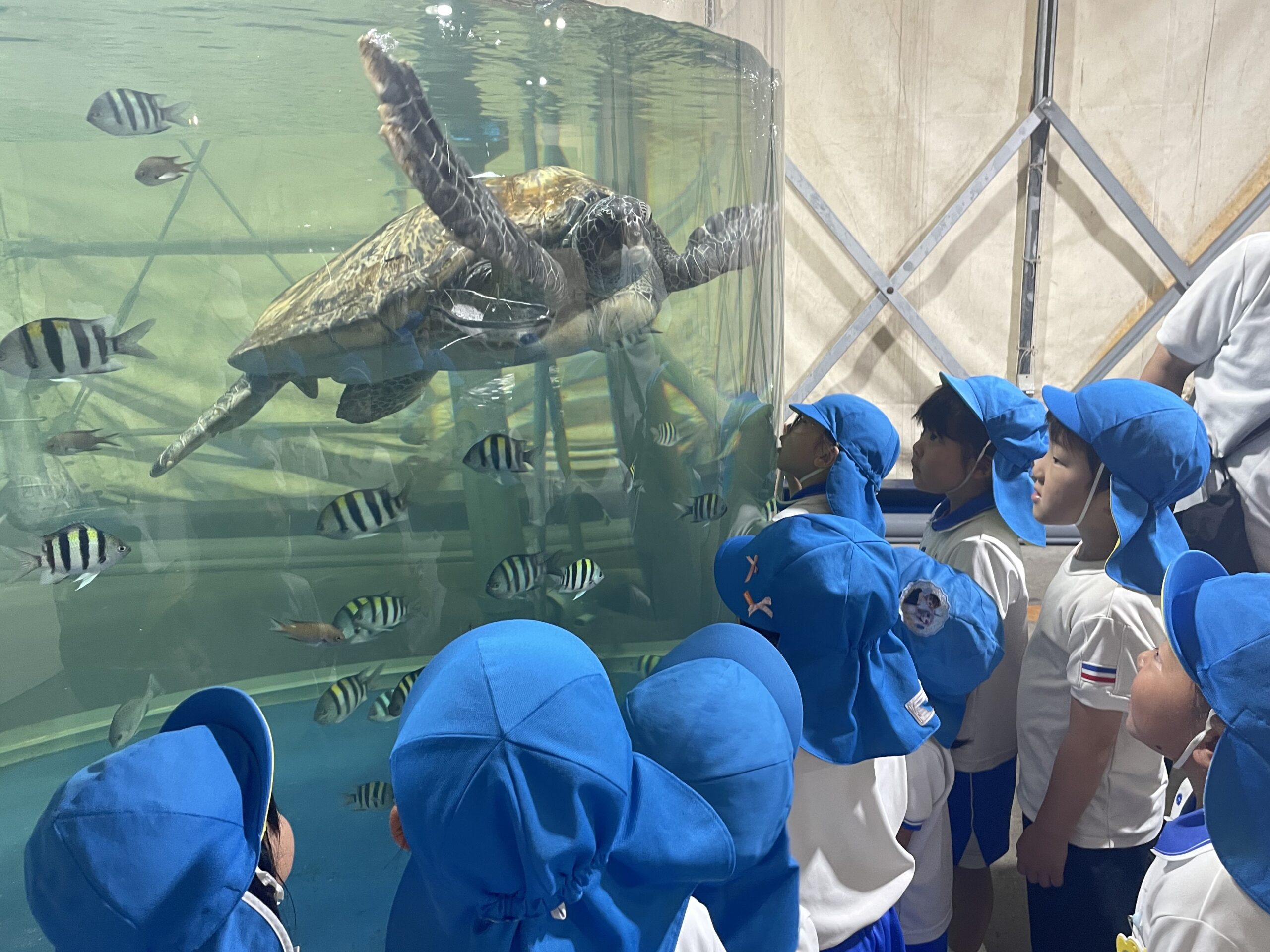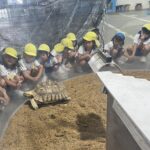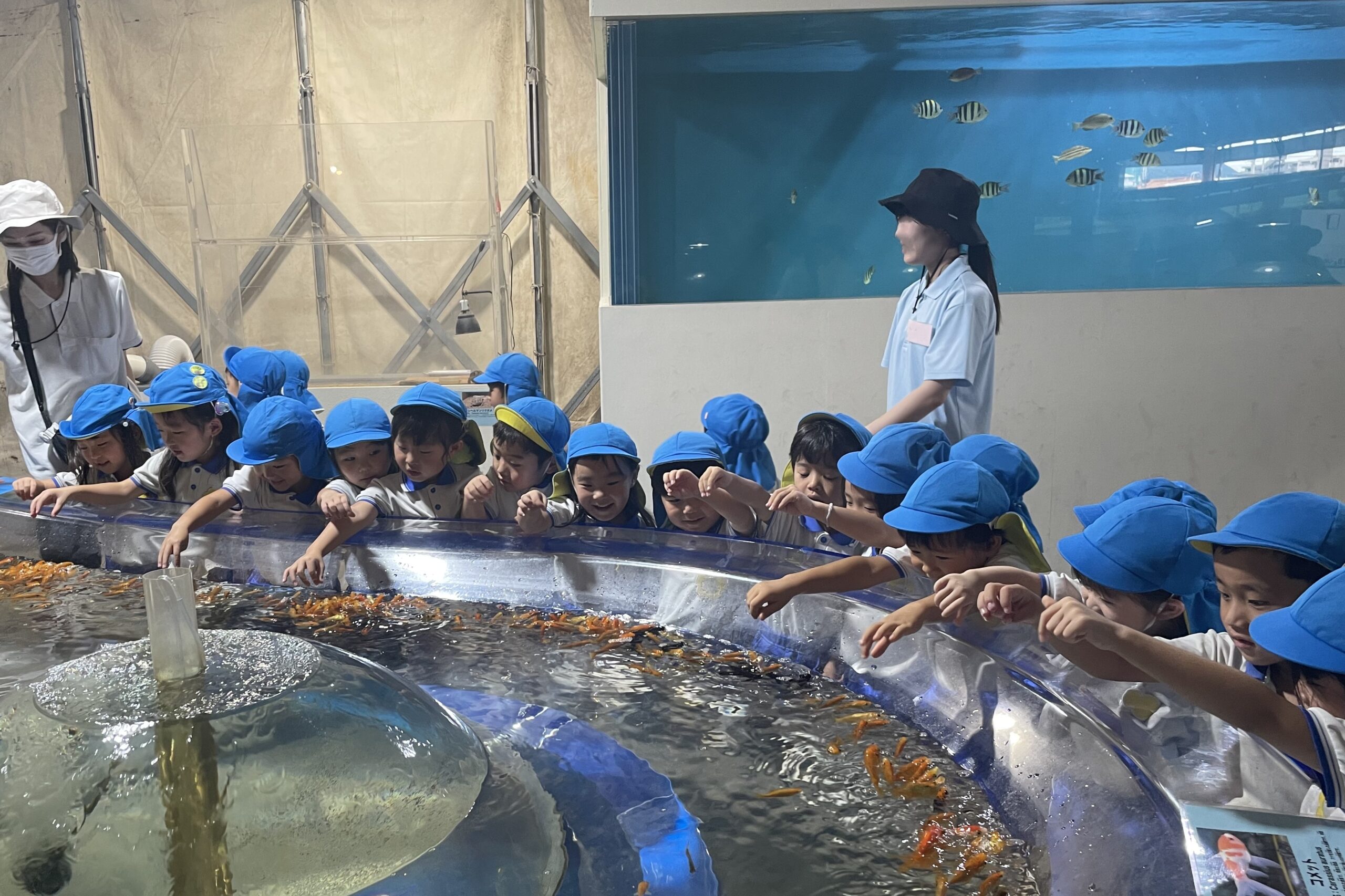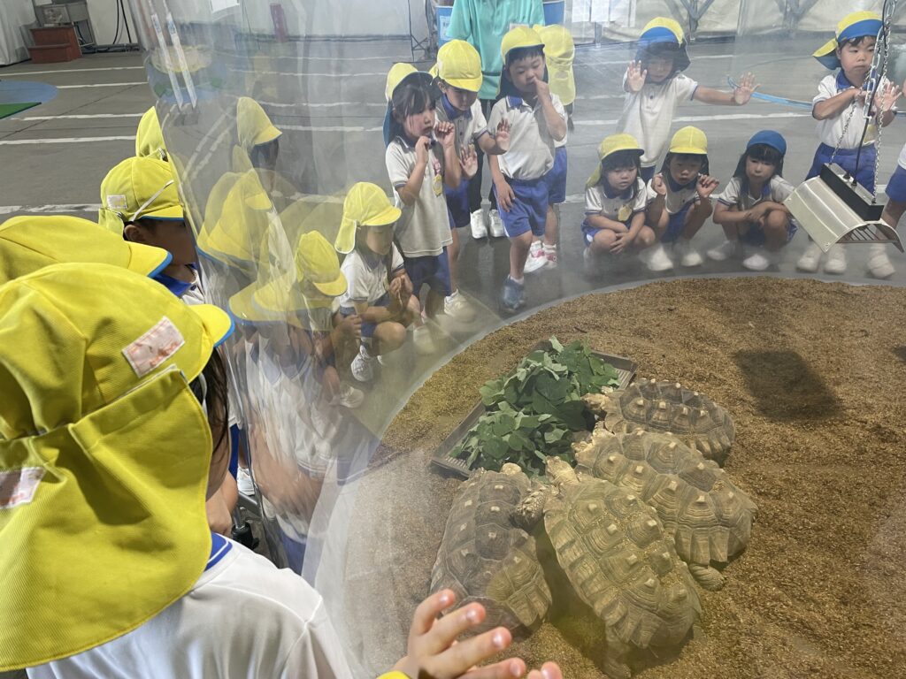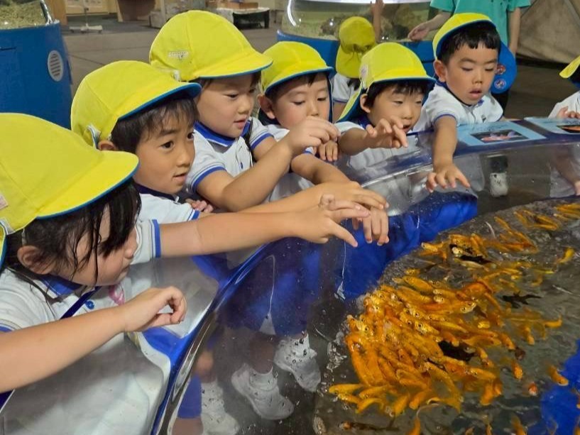 9月4日(木)に菊1・2組が、9月8日(月)に菊3・4組が市場水族館へ行きました。市場水族館は「新屋島水族館」が大規模リニューアル工事をする為の仮設水族館で、高松市中央卸売市場の旧青果棟にオープンしています。新屋島水族館の生き物(ペンギン、コツメカワウソ等)が展示されており、たくさんの海の生き物たちに子どもたちは大興奮でした。大きな水槽越しにいろいろな生き物を観ることができ、ウミガメやコツメカワウソの生き物たちに顔をくっつけて観ている姿がとても可愛らしかったです。どのクラスも一番のお気に入りは金魚がた~くさんいる水槽。近づくだけで一斉にパクパクと口を動かす様子が面白いようで釘付けになって観ていました。