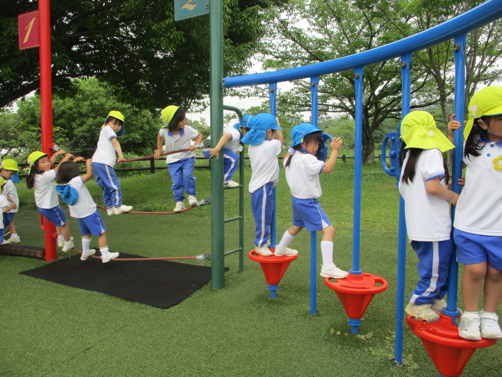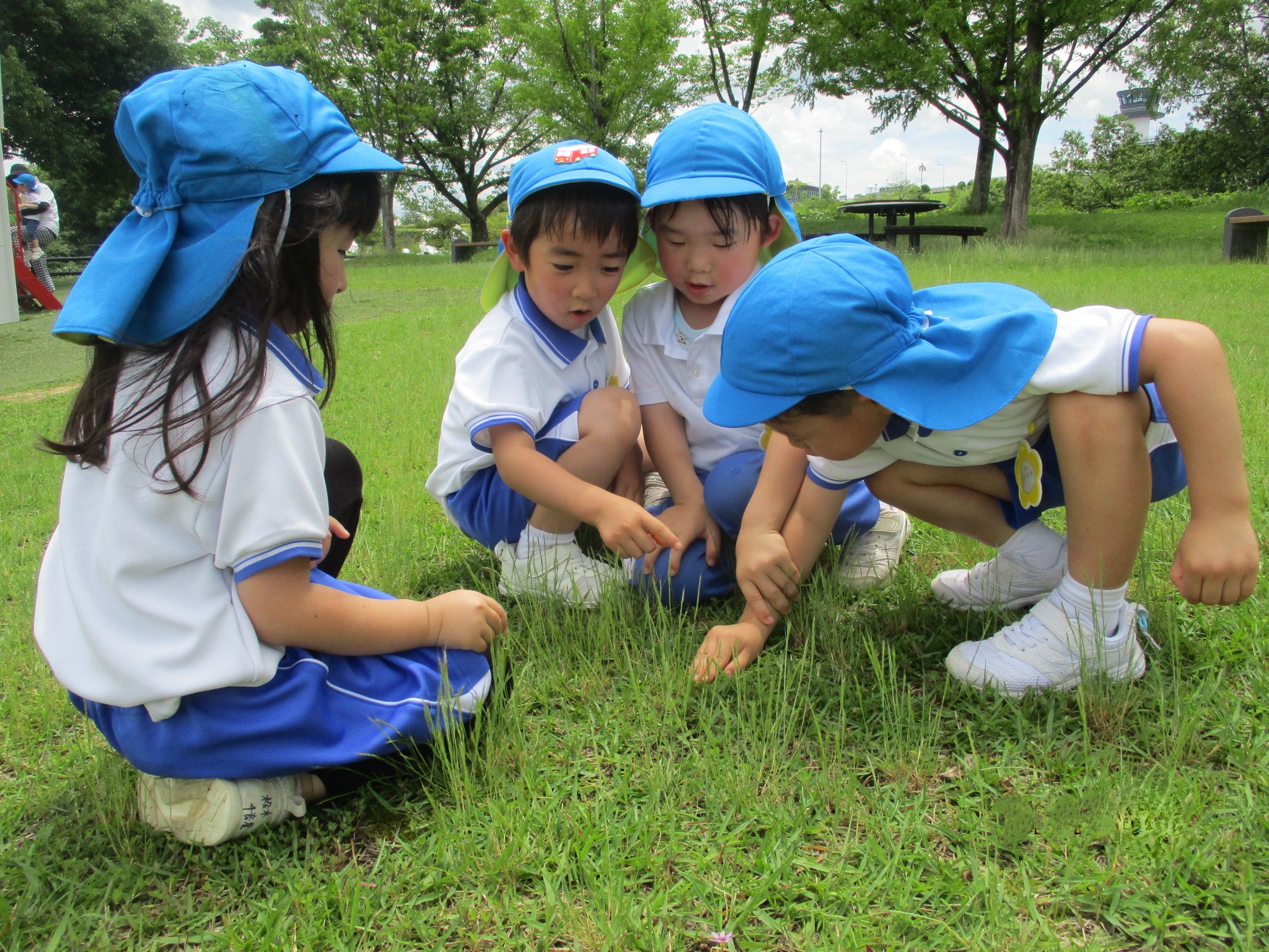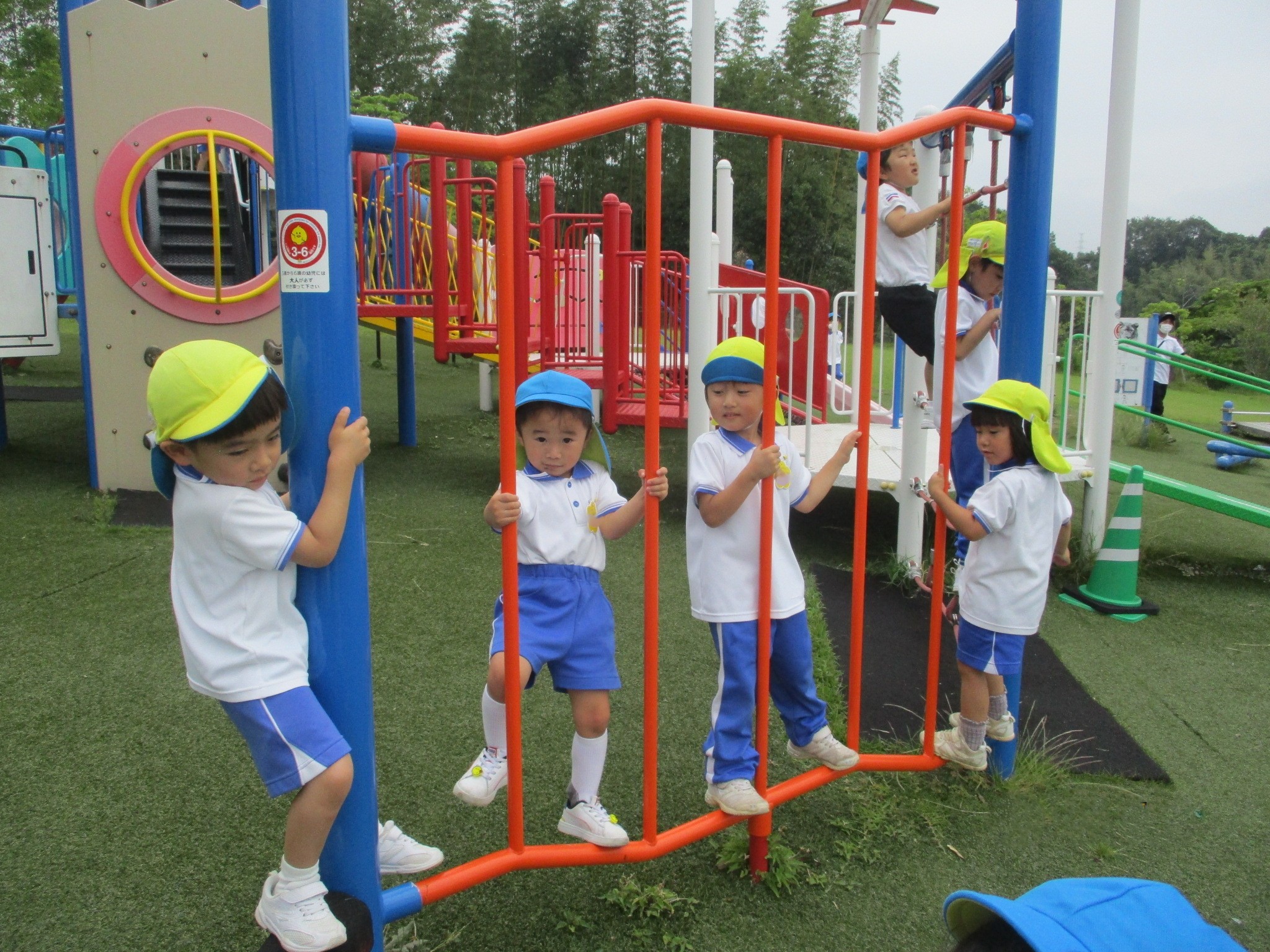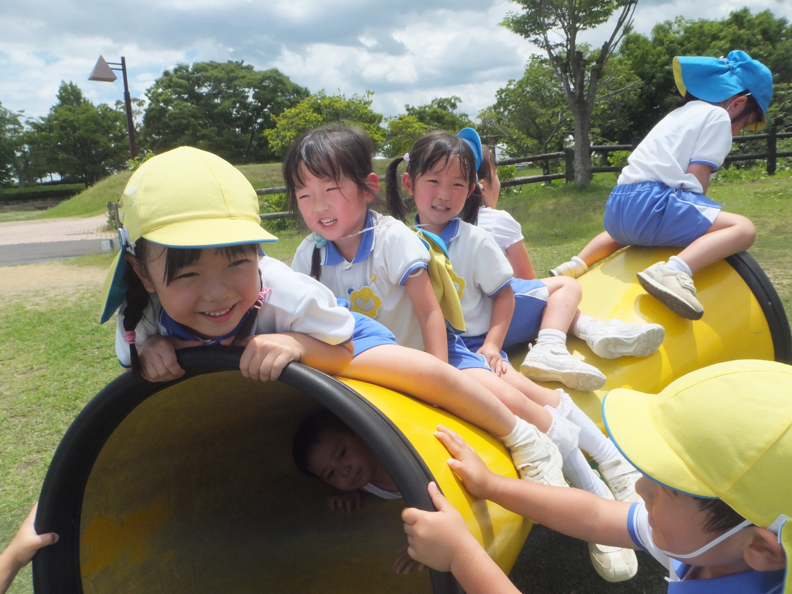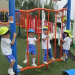6月13日(金)に菊2・3組が、6月16日(月)に菊1・4組が「さぬき空港公園」へ遊びに行きました。梅雨で雨が降ったり止んだりの毎日で「行けるかな、どうかな。」と心配していたので、行けるとなった時は「やったー!」と大喜び。ウキウキしながらバスに乗って出発しました。 公園ではちびっこ広場で遊びました。いろいろなアスレチックの遊具に挑戦したり友達と虫を探したり、生き生きとした楽しそうな笑顔がいっぱい見られました。「さすが菊組さん✨」と感じたことは、みんな順番を守ったり譲り合ったりしながら上手に遊んでいること。どんどん遊びたい気持ちもあるのに友達のことまで考えて遊べるなんで素敵だなと思いました。 園外保育の楽しみのもう一つはみんなでバスに乗って行くこと。片道約30分かかる長い道のりでしたが、「自分の家がこの近く」や「このお店、行ったことある」等の話が盛り上がっていましたよ。バスのお約束で『お話は小さな声で』というのがありますが、話に夢中になりついつい声が大きくなってしまう子どもたちです。