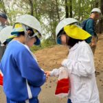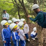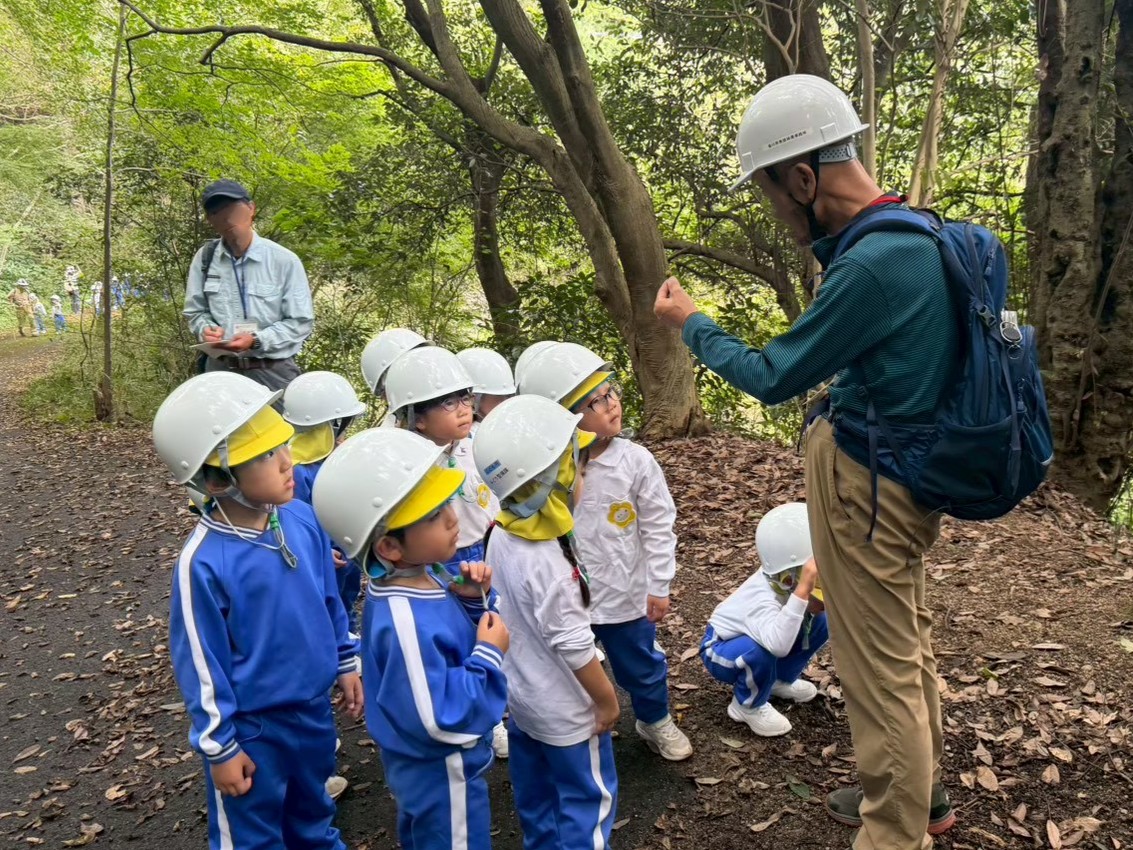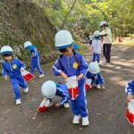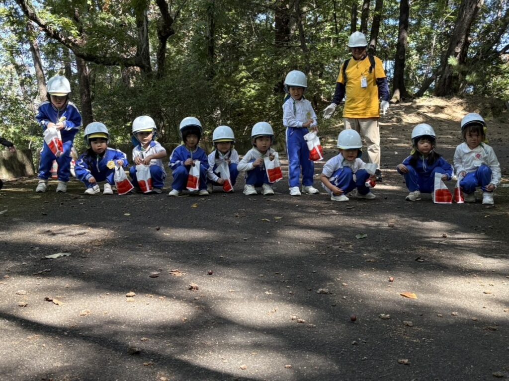 まず初めにドングリランドのスタッフの方に、森での約束・森の魅力や楽しさ・住んでいる生き物・危険な生き物等、様々なお話をしていただきました。みんなとても興味深く聞いていましたよ。その後、安全対策の為にヘルメットを被って「いざ森へ出発!」。スタッフの方や里山ボランティアの方がグループに1人以上入ってくださり、散策しながらいろいろな葉っぱや木の実等を見せてくださったり、自然に関するお話をしてくださったりしました。目的地に着くと、たくさん落ちているドングリに目を輝かせ「ドングリあった!」「ここにもある!」と、嬉しそうに見せ合っていました。グループでドングリコロコロ競争もしましたよ☆