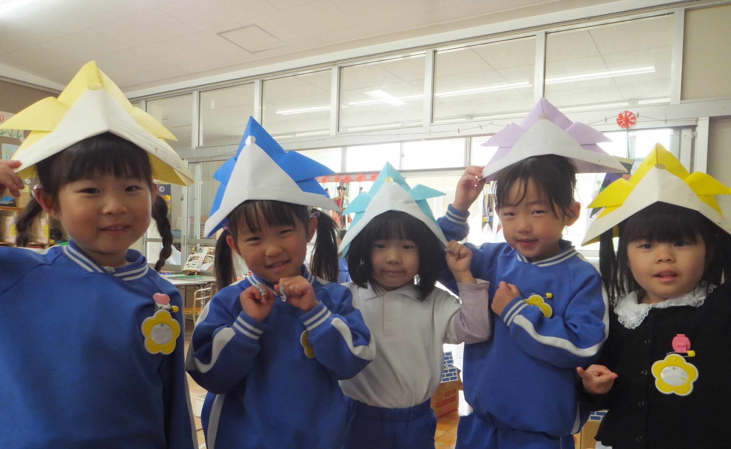 また、菊組さんは昨年桜組さんからもらった経験を活かして、大型折り紙を自分で折ることに挑戦しましたよ。桜組さんは、梅組さんへのプレゼントとは別の折り方で、和柄の兜を作りました。