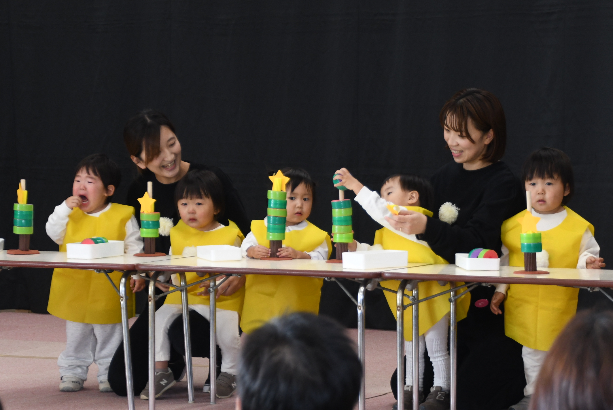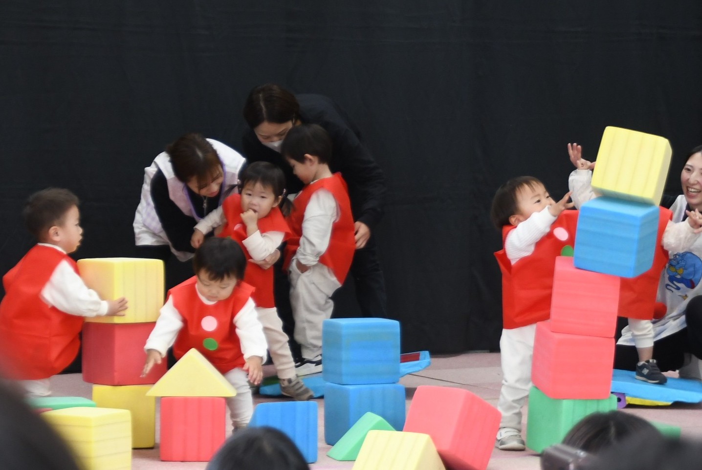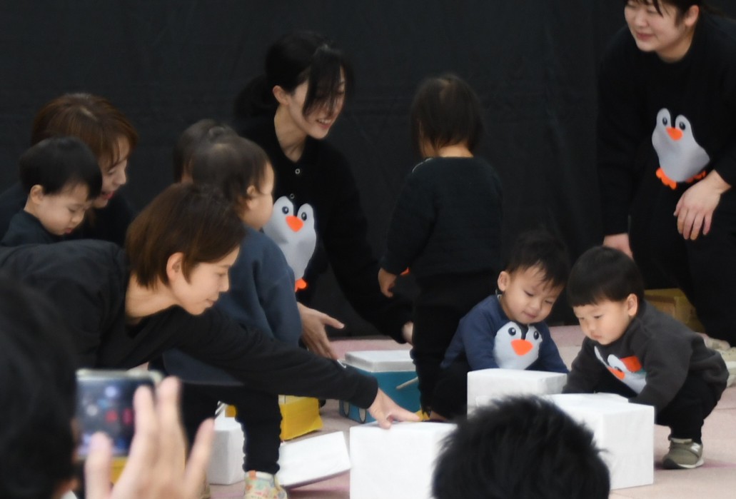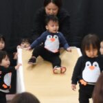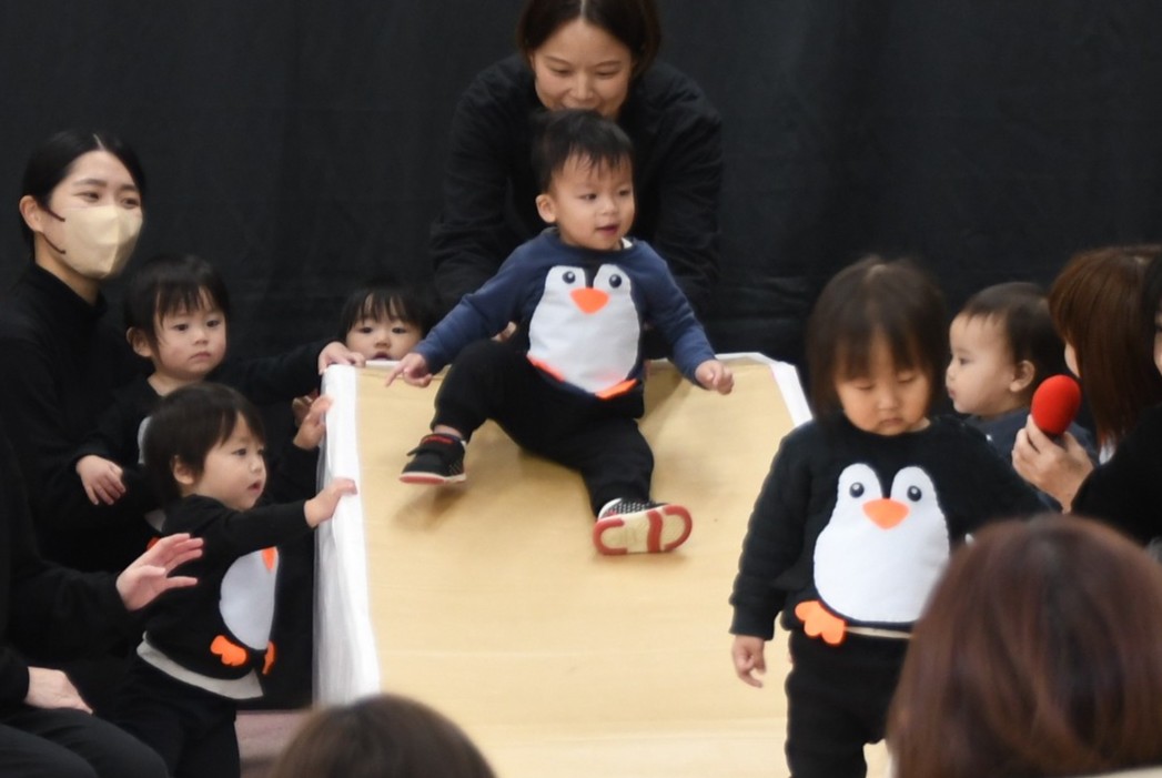 いちご組さんたちにとって初めてのステージ!ドキドキしている人やブロックに夢中な人など、それぞれの姿を見せてくれながら、可愛いペンギンになって大好きな踊りや滑り台を楽しんでいました。お返事も頑張っていましたよ~!