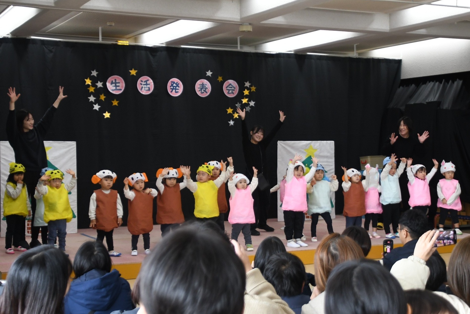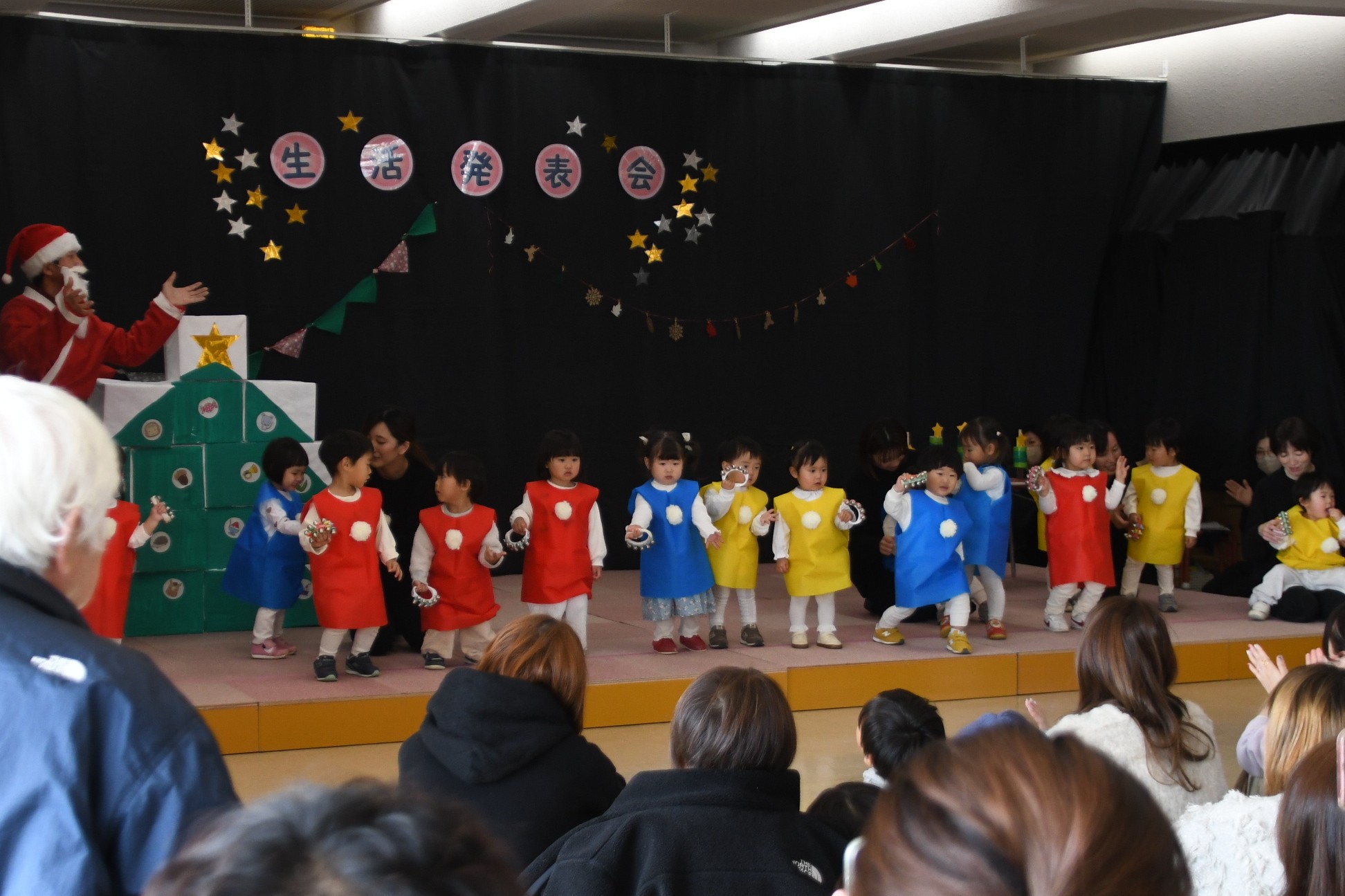 12月20日(土)、本園北館3階ホールで、0歳児いちご組・1歳児みかん組・2歳児りんご組の生活発表会が行われました。