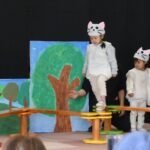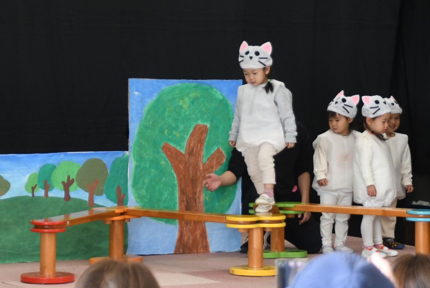 りんご2組さんは、大好きな歌の「ぞうさんのぼうし」の劇遊びをしました。それぞれの好きな動物の役になりきり、ボール投げや一本橋、飛び石などに挑戦!友達と一緒にステージに立ち、できるようになった遊びをたくさん披露してくれました。そしてみんなで大きな帽子に入って「ギュー・ギュ!」可愛い姿を見せてくれましたよ!